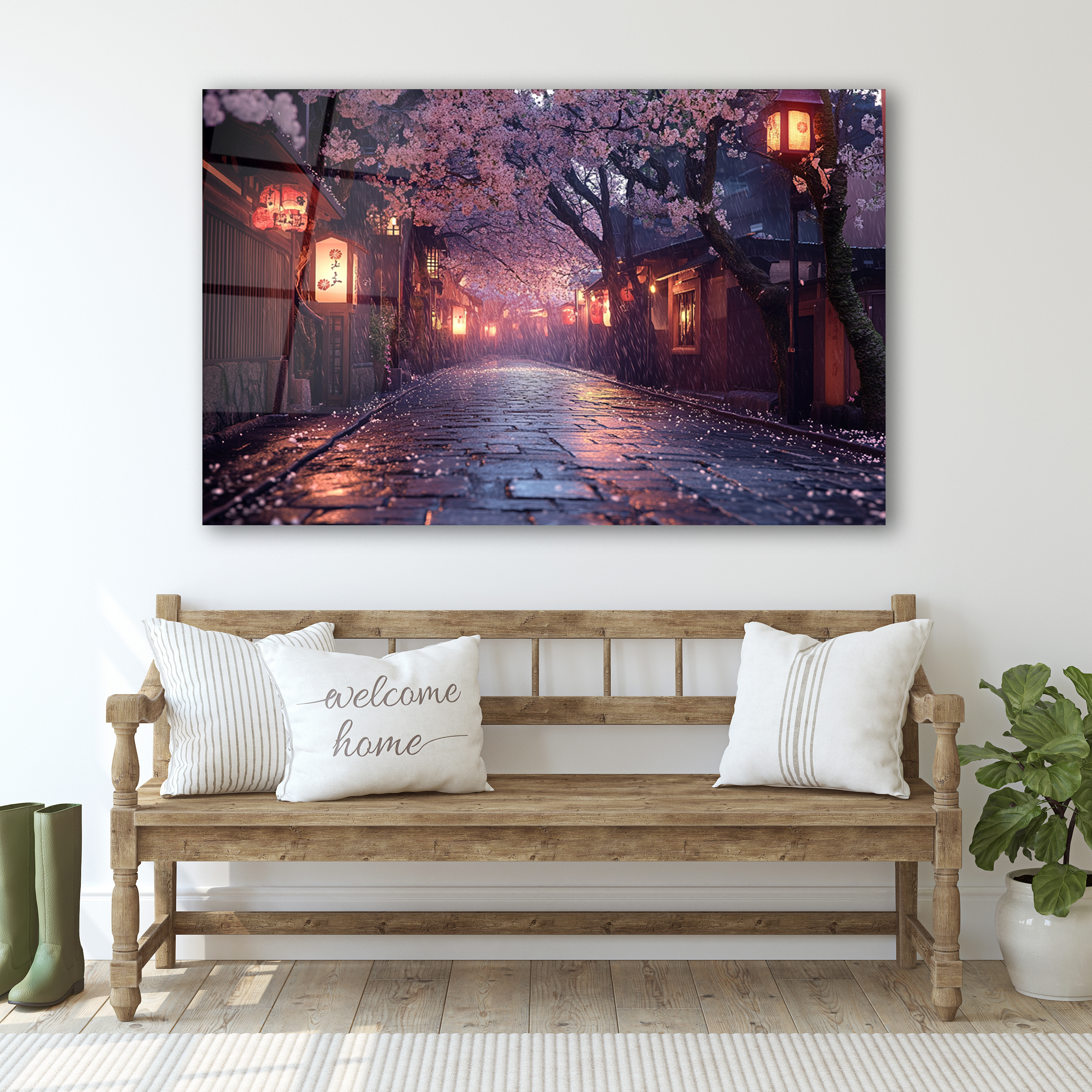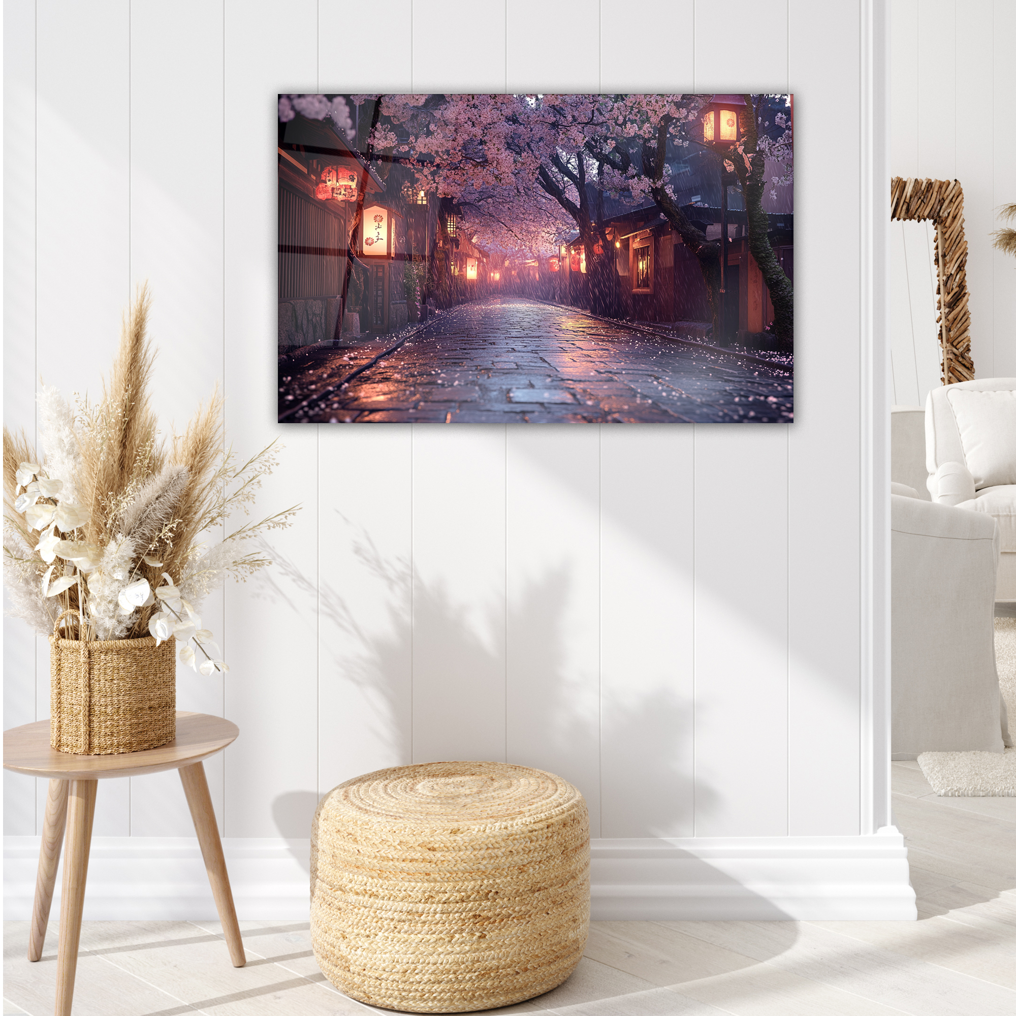 Japanese Sakura Street Glass Art, Kyoto Lantern Rain Print,