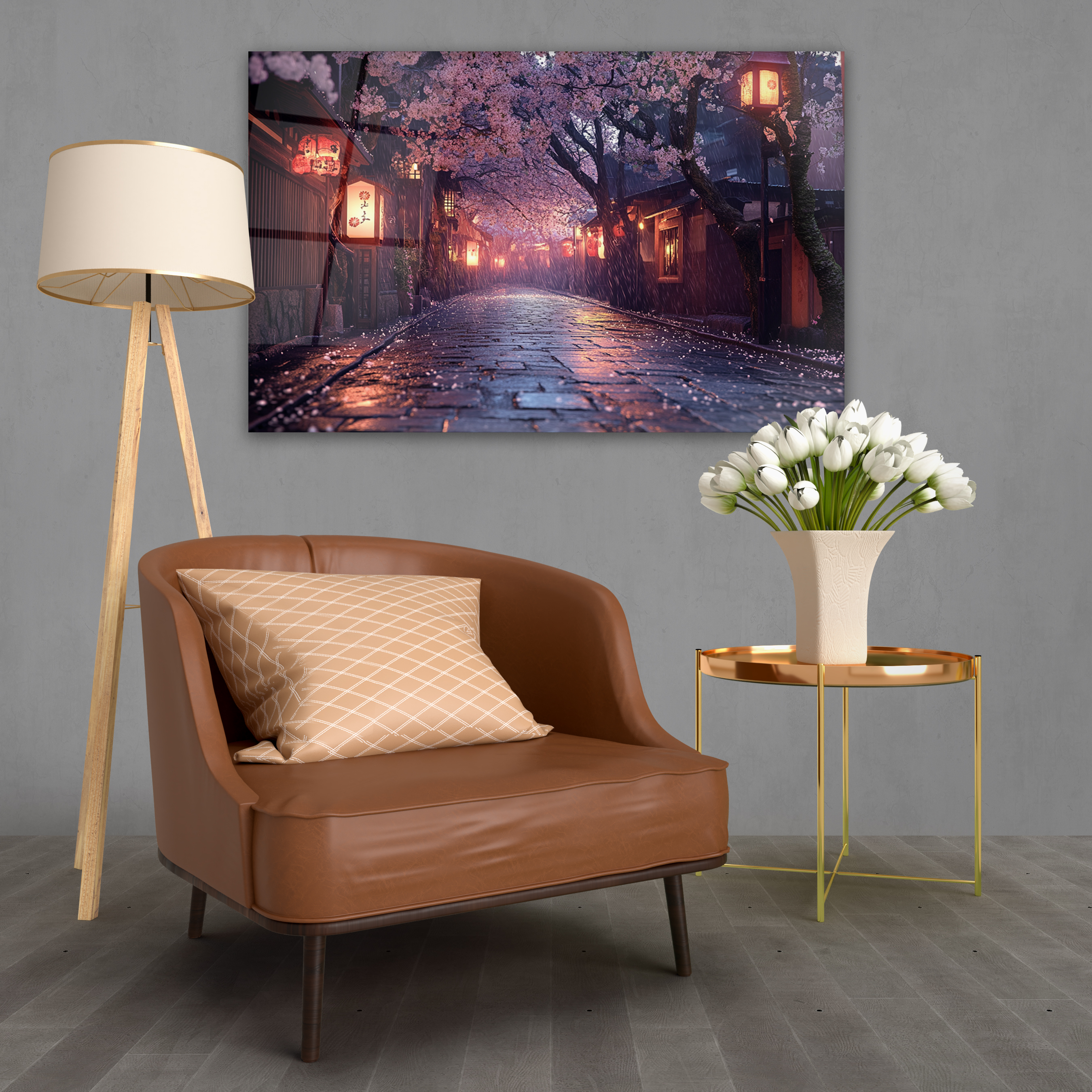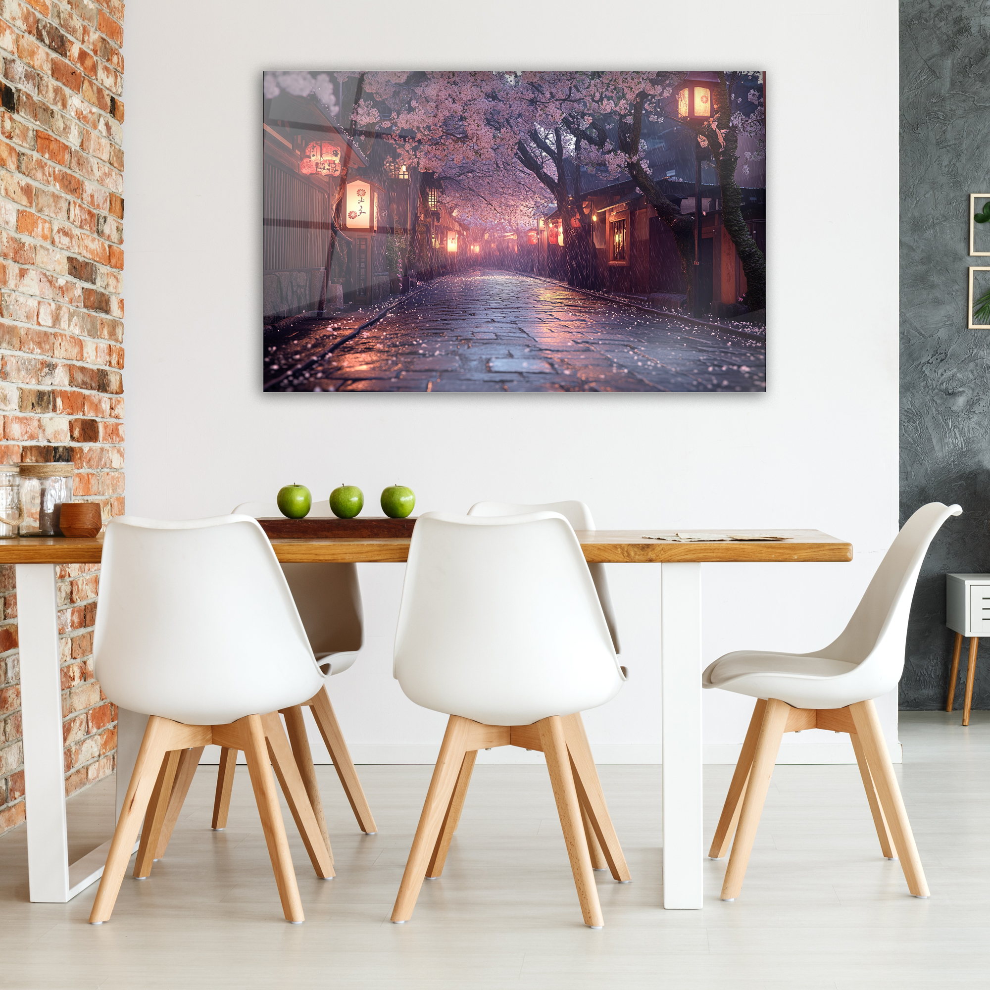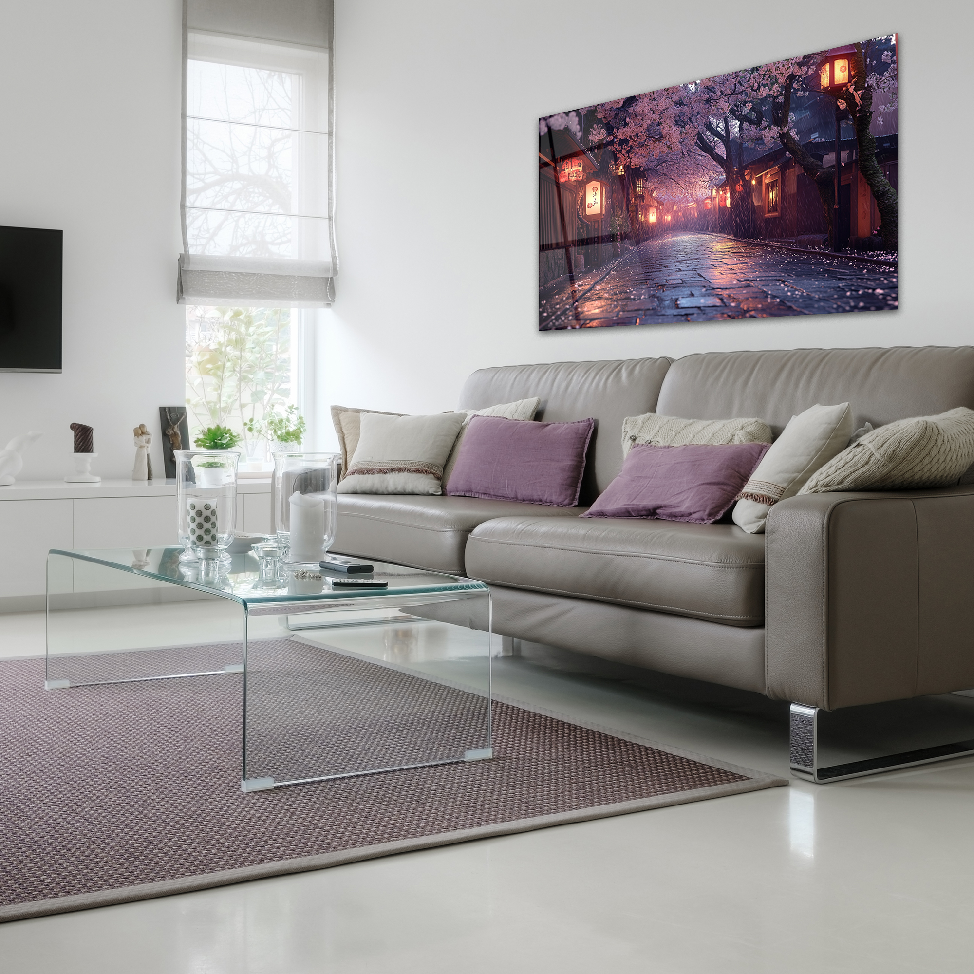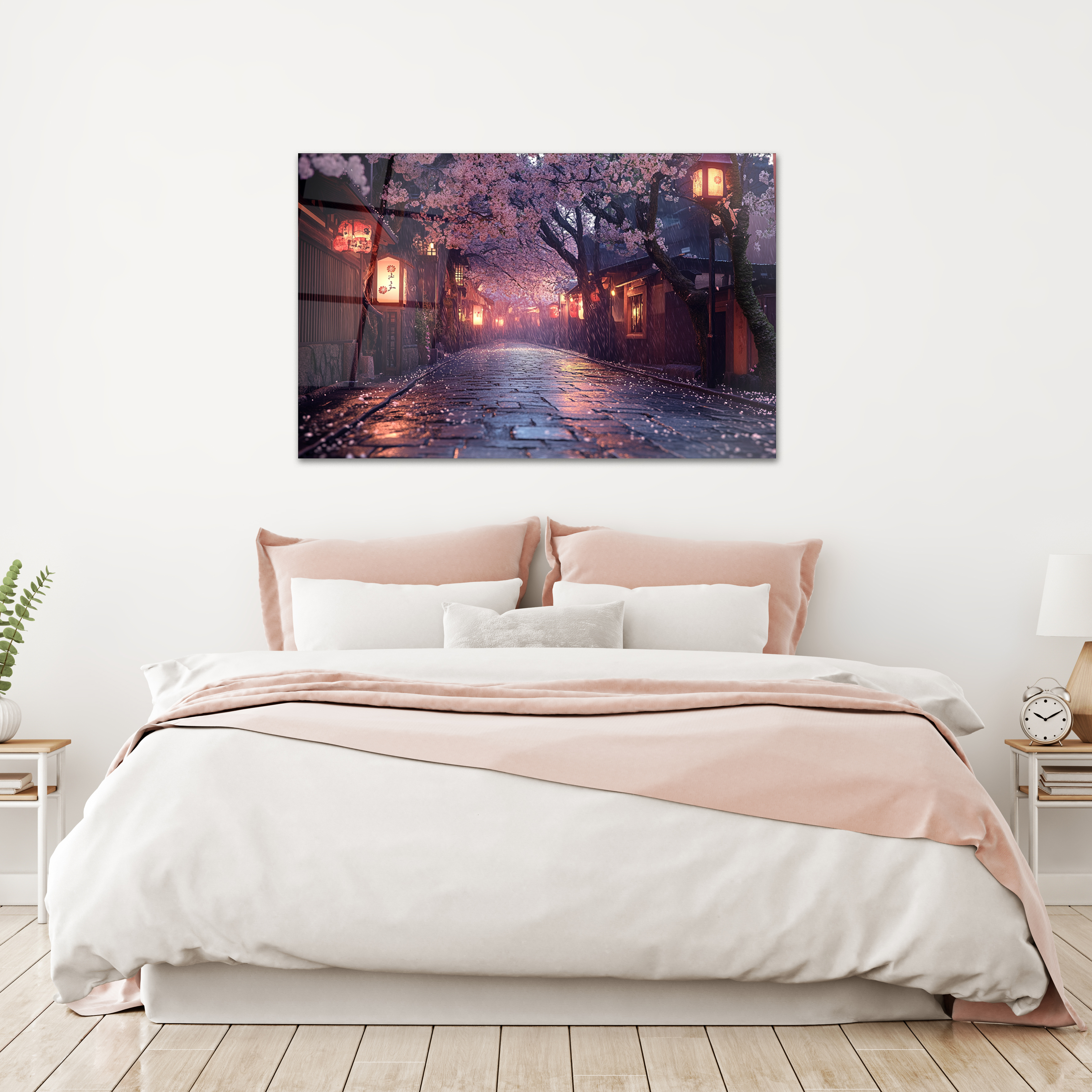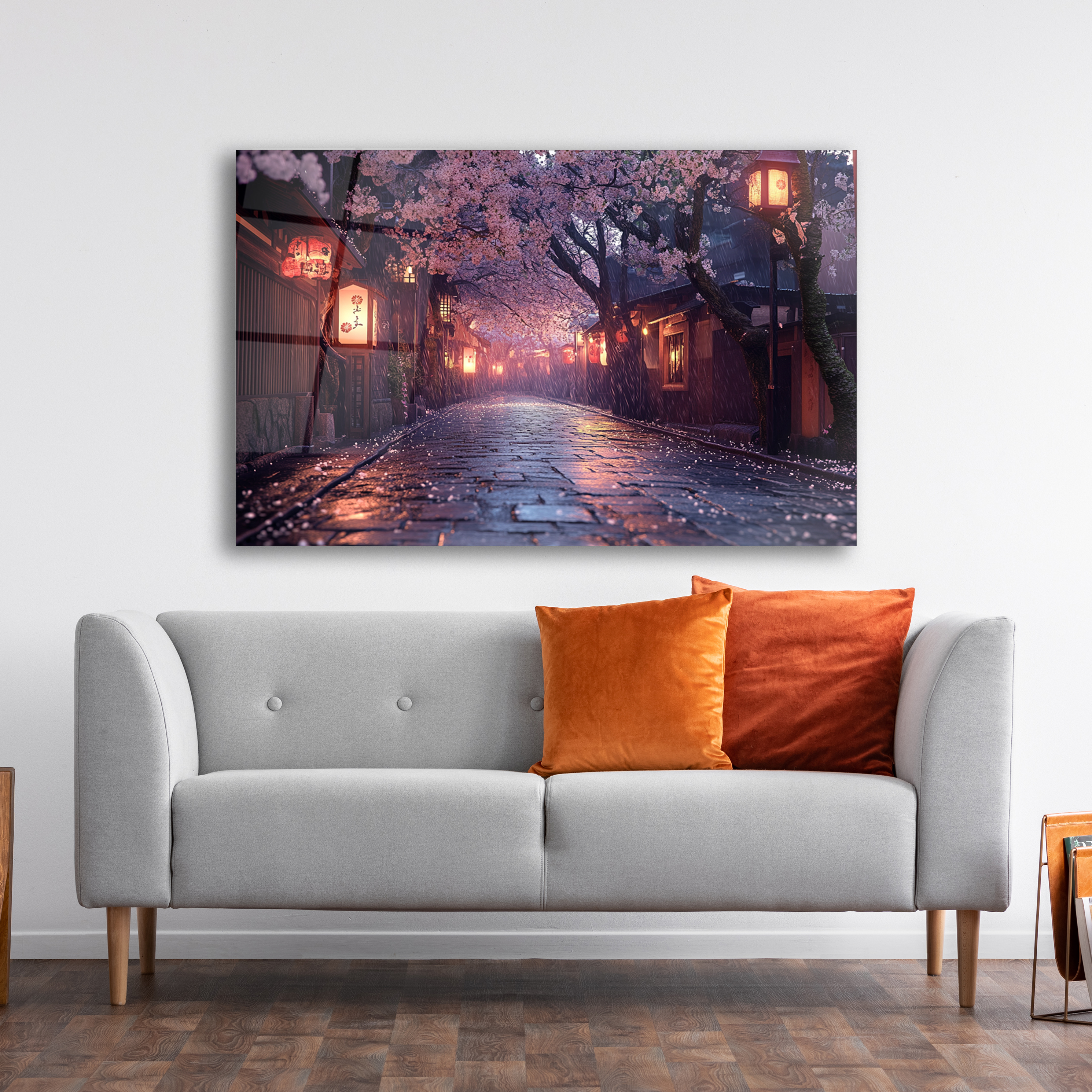 Japanese Sakura Street Glass Art, Kyoto Lantern Rain Print,